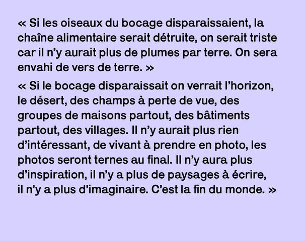 Que représente le bocage que nous habitons ? Que nous raconte t-il ? Est-ce un refuge ? Pourquoi y tenons-nous tant ? Et s’il disparaissait complètement, qu’adviendrait-il de notre paysage... et de notre imaginaire ?
